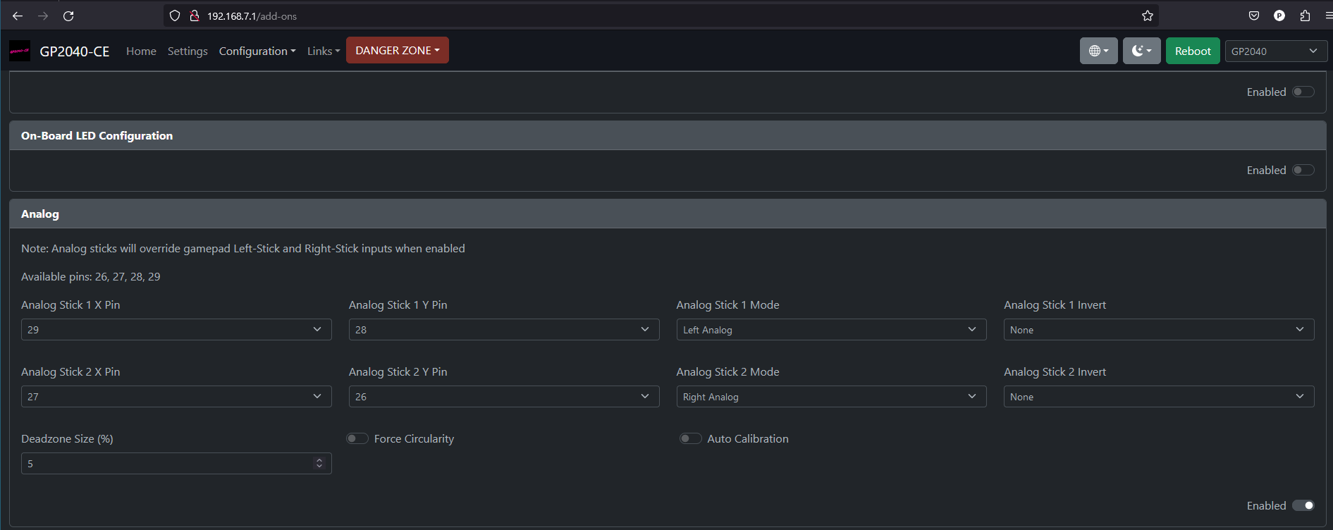 애드온 설정에서 Analog를 선택하고 Enabled를 시킨다. 그리고 각각의 좌우 스틱 연결 핀 번호를 입력한다.